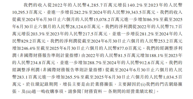 随着行业规模迅速攀升,鸣鸣很忙实现了业绩狂飙。2022年、2023年、2024年及2025年上半年,鸣鸣很忙实现营业收入分别为42.86亿元、102.95亿元、393.44亿元、281.24亿元,经调整的利润净额分别为0.81亿元、2.35亿元、9.13亿元、10.34亿元。