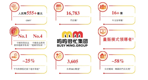 2024年,鸣鸣很忙录得商品交易总额(GMV)555亿元,到2025年上半年录得GMV约为411亿元,较2024年同期增长86.9%。按此数据计,鸣鸣很忙是中国最大的连锁零售商,亦是中国第四大连锁零售商。