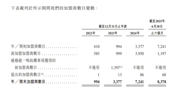 截至2022年、2023年和2024年末以及2025年6月末,加盟商数目分别为994家、3377家、7241家、8378家;退出加盟商的数目分别为1家、13家、86家、60家;新增加盟商的数目分别为585家、999家、3950家、1197家,其中2025年上半年新增加盟商不足去年全年新增加盟商的三分之一。