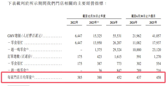 门店过度密集会直接造成老店客源分流、销售额下滑。招股书显示,鸣鸣很忙门店日均单量2024年为452单,同比增长16.49%,2025年上半年则为458单,同比仅增长4.81%。
