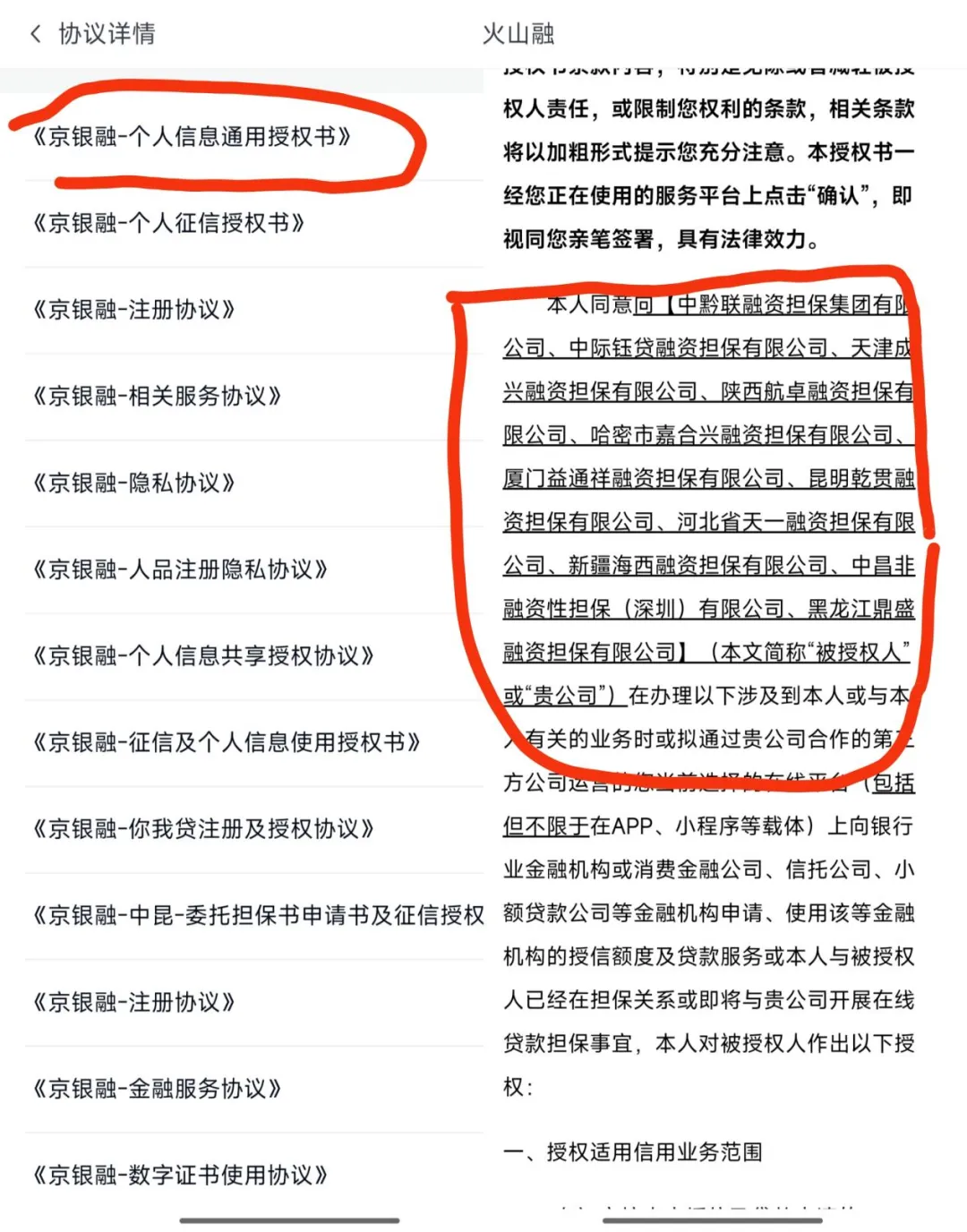火山融的《京银融-个人信息通用授权书》中,竟又套娃了10份授权书。其中第1、2、3、5、6协议,分别向北京久恒融资担保有限公司、数玥网络技术(杭州)有限公司、西安鸿飞融资担保有限公司、众利数字科技(广州)有限公司、咸阳华瑞融资担保有限公司授权个人信息。