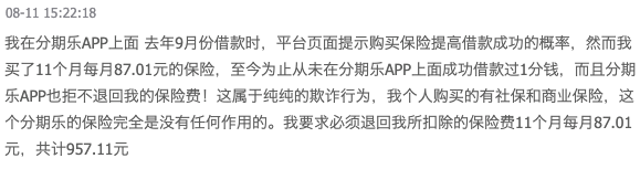 还有用户表示,分期乐变相诱导用户购买保险提高借款成功率等。一用户称,“去年9月份我在分期乐APP上面借款时,平台页面提示购买保险提高借款成功的概率,然而我买了11个月每月87.01元的保险,至今为止从未在分期乐APP上面成功借款过1分钱,而且分期乐APP也拒不退回我的保险费!这属于纯纯的欺诈行为,我个人购买的有社保和商业保险,这个分期乐的保险完全是没有任何作用的。我要求必须退回我所扣除的保险费11个月每月87.01元,共计957.11元。”