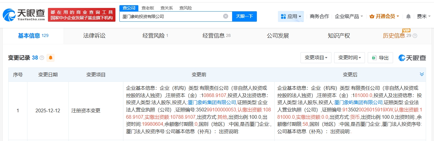 天眼查App显示,近日,厦门象屿投资有限公司发生工商变更,注册资本由约1.09亿人民币增至18.1亿人民币,增幅约1565%。