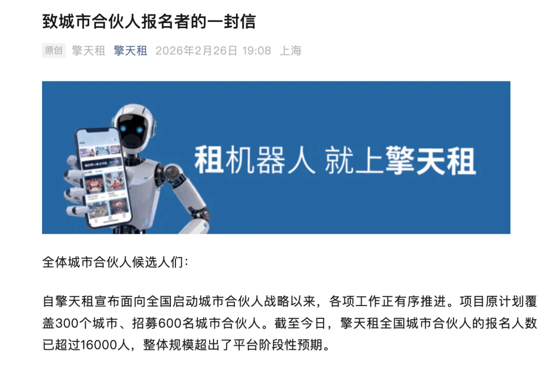 在擎天租官方最新发布的《致城市合伙人报名者的一封信》中,擎天租披露,原计划招募600名城市合伙人,目前报名人数已超过16000人;平台成立两个月,可调度机器人规模已超3000台;春节期间订单环比增长近70%。这些数字无疑强化了“规模正在快速放大”的市场印象。