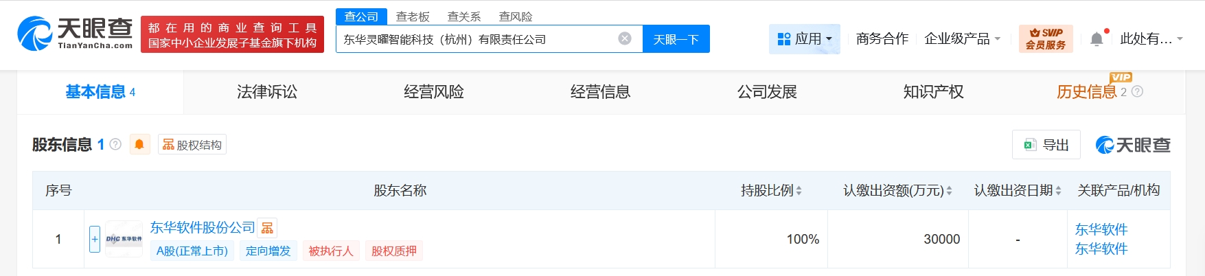 天眼查App显示,近日,东华灵曜智能科技(杭州)有限责任公司成立,法定代表人为尹继南,注册资本3亿人民币,经营范围含信息系统集成服务、人工智能应用软件开发、信息技术咨询服务、云计算装备技术服务、云计算设备销售、网络与信息安全软件开发、信息系统运行维护服务、计算机软硬件及辅助设备零售、人工智能基础资源与技术平台、物联网设备销售等。股东信息显示,该公司由东华软件(002065)全资持股。