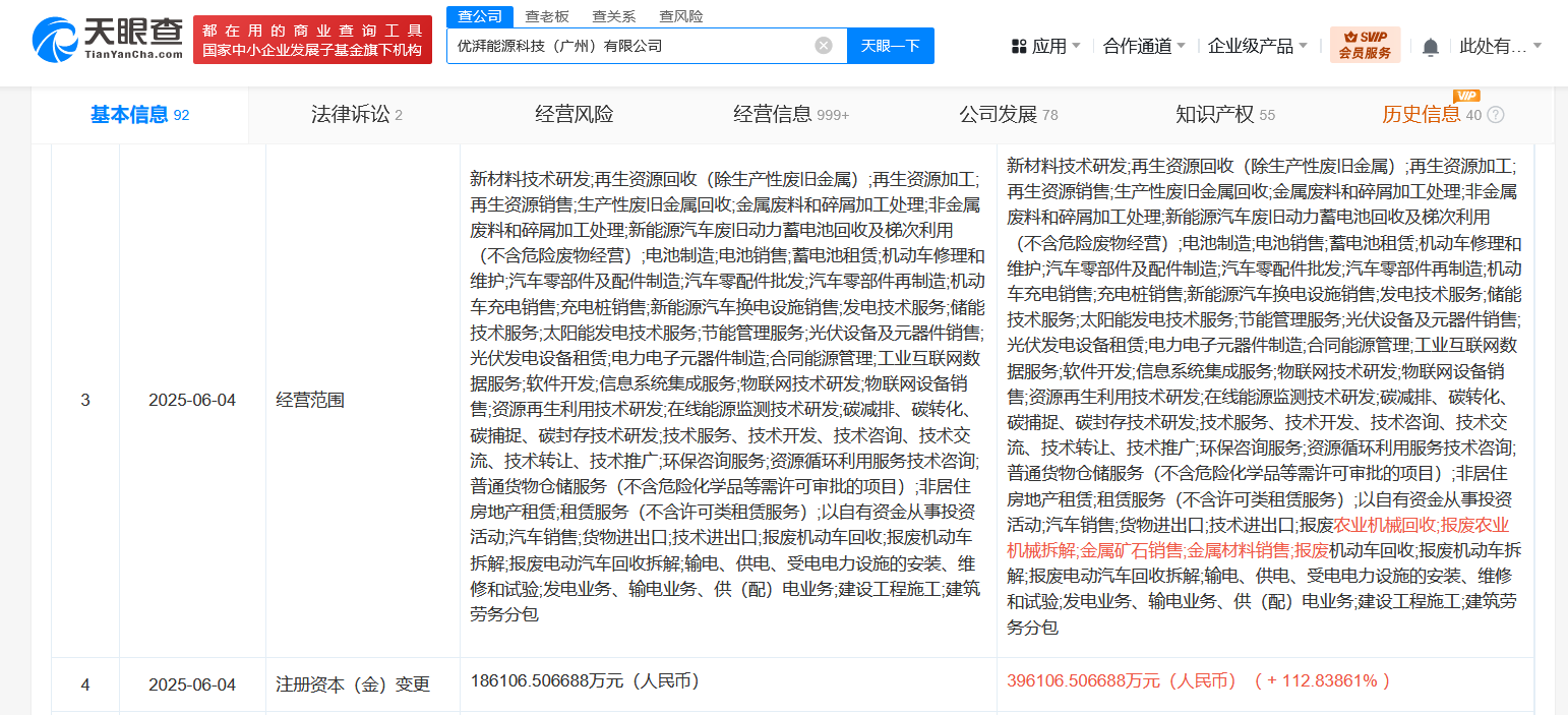 天眼查App显示,近日,优湃能源科技(广州)有限公司发生工商变更,注册资本由约18.61亿人民币增至约39.61亿人民币。