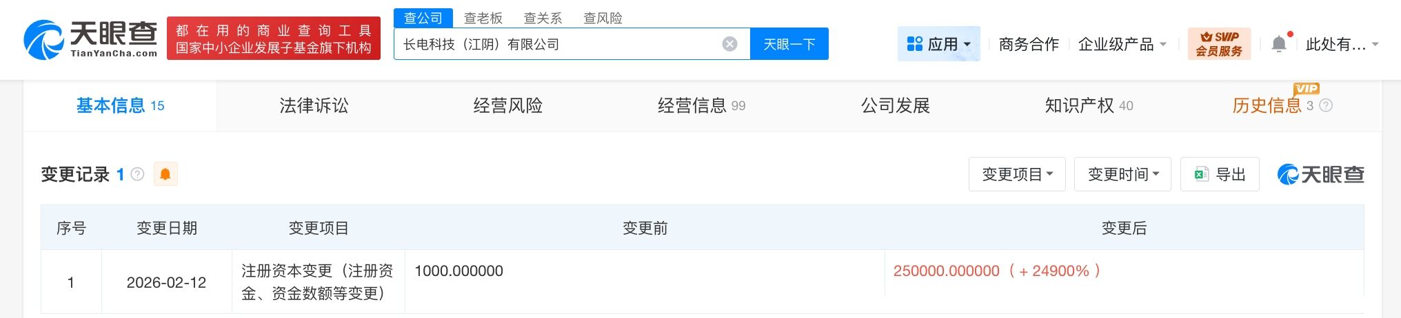 天眼查App显示,近日,长电科技(江阴)有限公司发生工商变更,注册资本由1000万人民币增至25亿人民币,增幅24900%。