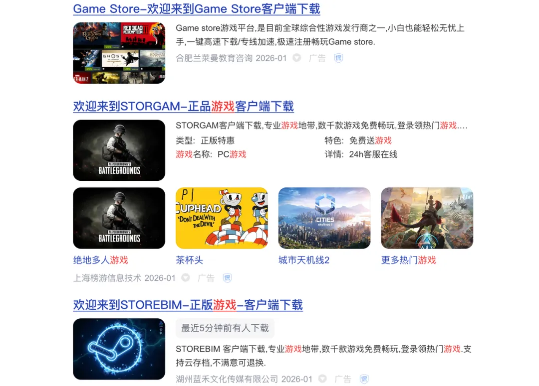 比如搜个 Steam,前几个都是广告,用户稍不注意或者不具有分辨能力,就很容易点到盗版网站。如果用户手里信息是充分的,能够分辨广告,他们就没有任何理由给盗版网站贡献点击量。