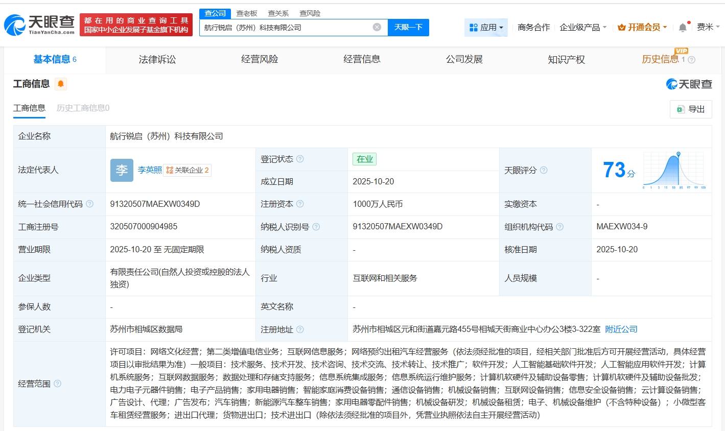 天眼查App显示,近日,航行锐启(苏州)科技有限公司成立,法定代表人为李英照,注册资本1000万人民币,经营范围包括网络文化经营、第二类增值电信业务、互联网信息服务等。