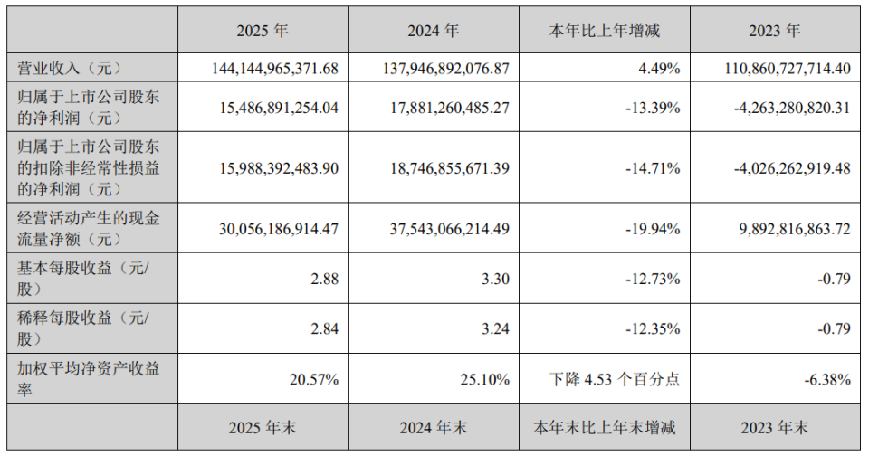 报告显示,牧原股份2025年实现营收1441.45亿元,同比增长4.49%;归属于上市公司股东的净利润为154.87亿元,同比下降13.39%;归属于上市公司股东的扣除非经常性损益的净利润为159.88亿元,同比下降14.71%。