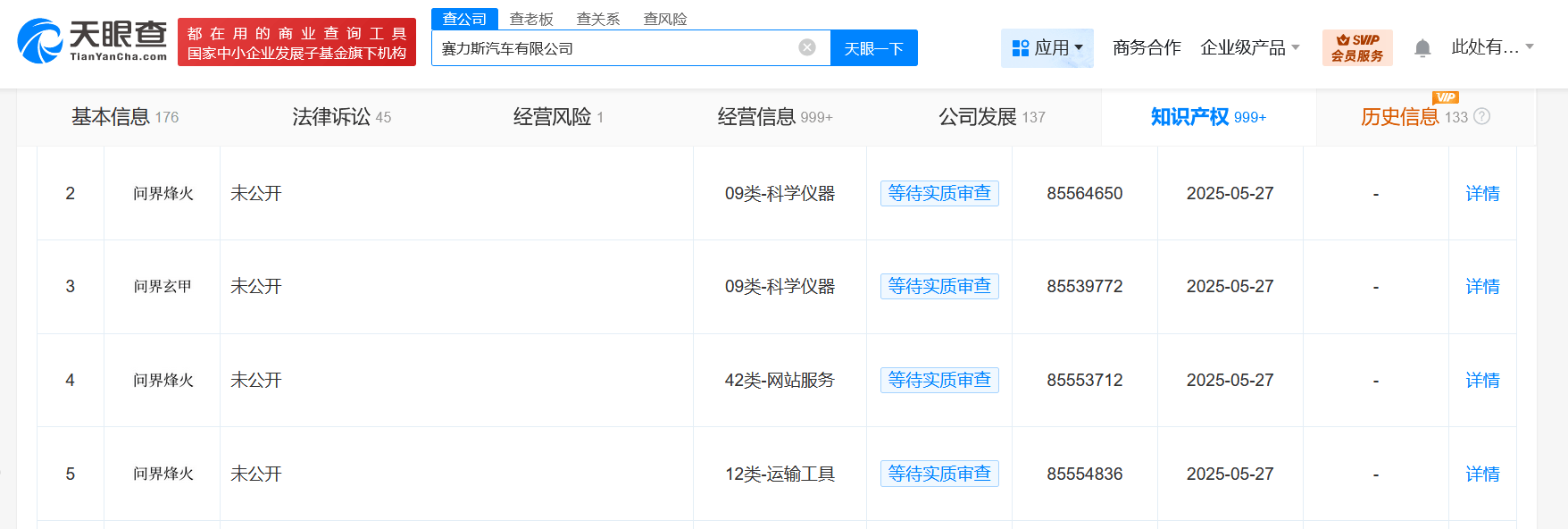 天眼查知识产权信息显示,近日,赛力斯汽车有限公司申请注册“问界烽火”“问界玄甲”商标,国际分类为科学仪器、网站服务、运输工具,当前商标状态均为等待实质审查。