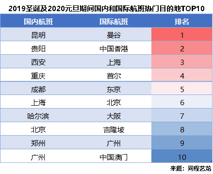 热门目的地方面,“双旦”期间国内航班热门到港城市前十位依次为:昆明、贵阳、西安、重庆、成都、上海、哈尔滨、北京、郑州、广州。国际航班到港城市依次为:曼谷、中国香港、上海、首尔、东京、北京、大阪、吉隆坡、广州、中国澳门。值得注意的是,“双旦”期间的国际航班出现了出境和入境双向客流高峰,除了香港和澳门外,上海、北京、广州等国内城市都是较为热门的国际航班目的地。