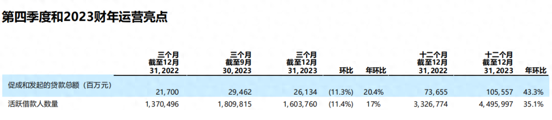 贷款业务:2023 年全年促成和发起的贷款总额为 1055.57 亿元,同比 2022 年的 736.55 亿元增长 43.3%。2023 年活跃借款人总数为 4495997 人,较 2022 年的 3326774 人增长 35.1%。
