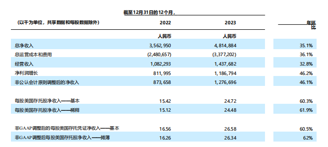 收入方面:2023 年总净收入为 48.149 亿元,较 2022 年的 35.63 亿元增长 35.1%。其中,营业收入为 14.377 亿元,同比增长 32.8%;净收入为 11.868 亿元,同比增长 46.2%。