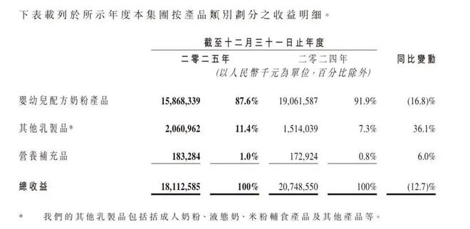 从产品结构看,尽管其他乳制品收入同比增长36.1%,占比提升至11.4%,营养补充品也实现6.0%的增长,但两者合计占比仍不足13%,难以对冲核心婴配粉业务的下滑压力。
