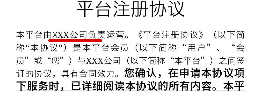 有的平台则缺少有效信息或信息模糊不清,例如上海荔客信息科技有限公司运营的乐分期、花借还呗、花借款呗、花借钱呗,在《用户协议》和《隐私政策》中均没有披露App运营方信息;而如皋智萃网络科技有限公司旗下的借款大王则在《注册协议》中自称“XXX公司”,连明确的公司名称都没有。