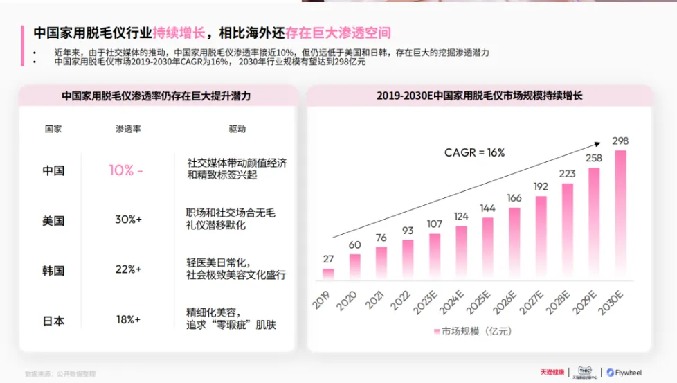 天猫健康发布的《2025家用脱毛仪行业洞察白皮书》显示,中国家用脱毛仪渗透率只有10%,远不及日韩等邻国。2025中国家用脱毛仪市场规模约144亿元,预计到2030年将翻一倍达到298亿元,未来五年复合增长率(CAGR)达到16%。
