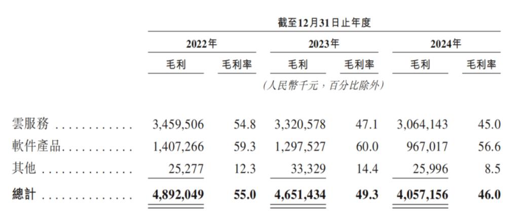 与此同时,云服务这一新增长曲线也已出现失速的情况:招股书显示,云服务2024年的营收同比下滑了约3.4%,毛利率从2022年的54.8%逐年递降至2024年的45%。