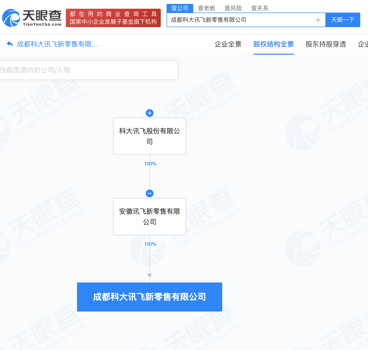 天眼查App显示,近日,成都科大讯飞新零售有限公司成立,法定代表人为徐荣盛,注册资本10万人民币,经营范围包括电子产品销售、办公设备耗材销售、办公设备销售、光学仪器销售、人工智能硬件销售、信息系统集成服务、智能家庭消费设备销售、智能机器人销售等。股权全景穿透图显示,该公司由科大讯飞(002230)旗下安徽讯飞新零售有限公司全资持股。