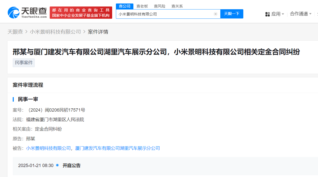 天眼查司法案件信息显示,近日,邢某与小米景明科技有限公司、厦门建发汽车有限公司湖里汽车展示分公司相关定金合同纠纷案件新增开庭公告,原告为邢某,该案件将于1月21日在福建省厦门市湖里区人民法院开庭审理。