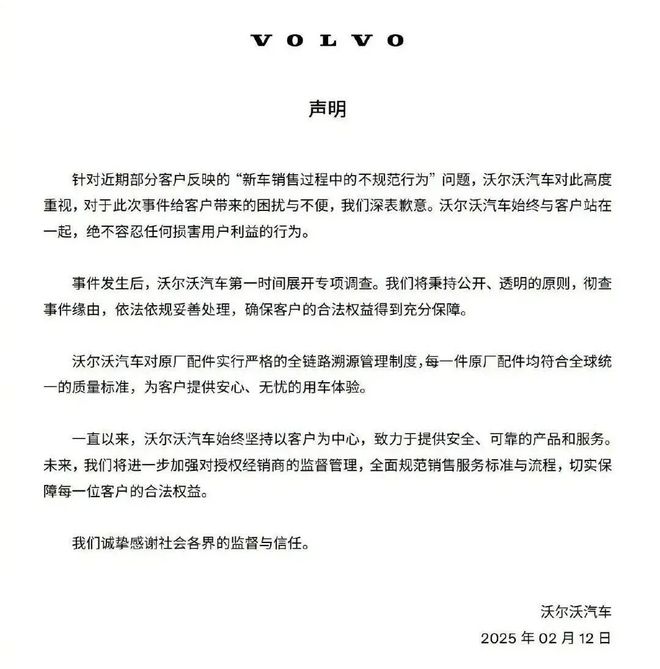 对此,2月12日,沃尔沃官方发声明回应称:“事件发生后,沃尔沃汽车第一时间展开专项调查。我们将秉持公开、透明的原则,彻查事件缘由,依法依规妥善处理,确保客户的合法权益得到充分保障。”