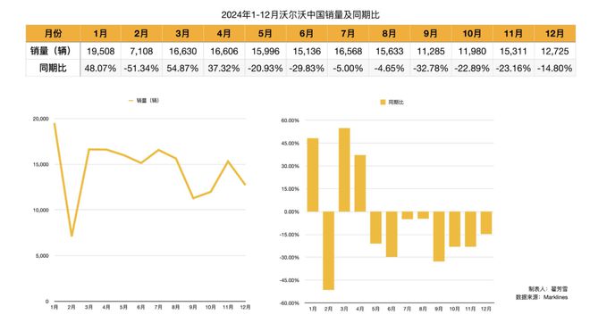 根据全球汽车数据平台Marklines的统计,沃尔沃2024年的在华销量从4月开始的销量同期比持续为负,销量环比也持总体下滑趋势,3月销量还有16630辆,到12月已降至12725辆。