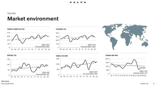 但沃尔沃在中国市场的销量在下降。沃尔沃汽车2024年的销量达到了156,370辆,同比下降8%。从沃尔沃发布的第四季度报告中可以看到,在卡车这一门类中,仅中国地区的销量在下跌。