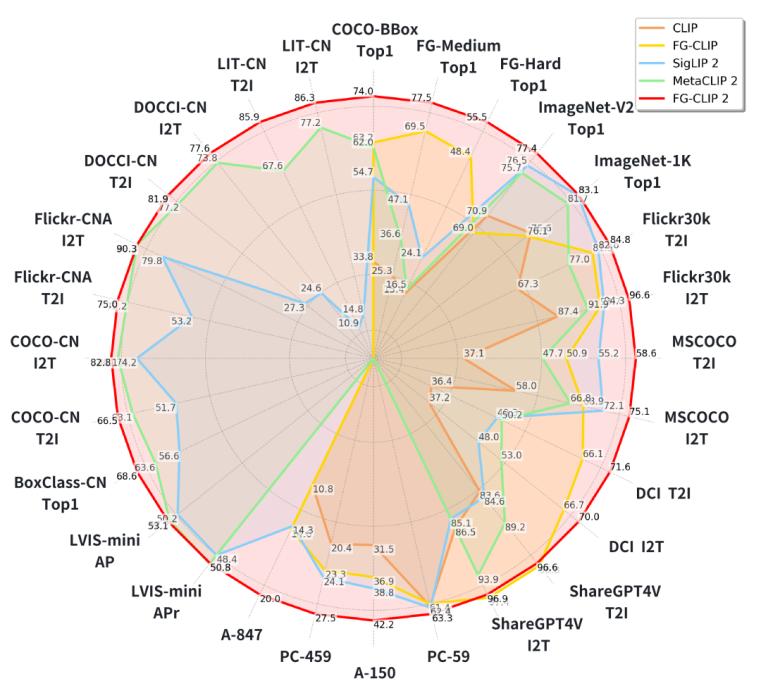 值得一提的是,在基座模型上,360的成果依旧出色。其图文跨模态模型FG-CLIP2作为全球首个支持细粒度图+文+视频对齐的跨模态VLM模型,在8大类29项多维度评测上超越Google的SigLIP 2和Meta的MetaCLIP2。