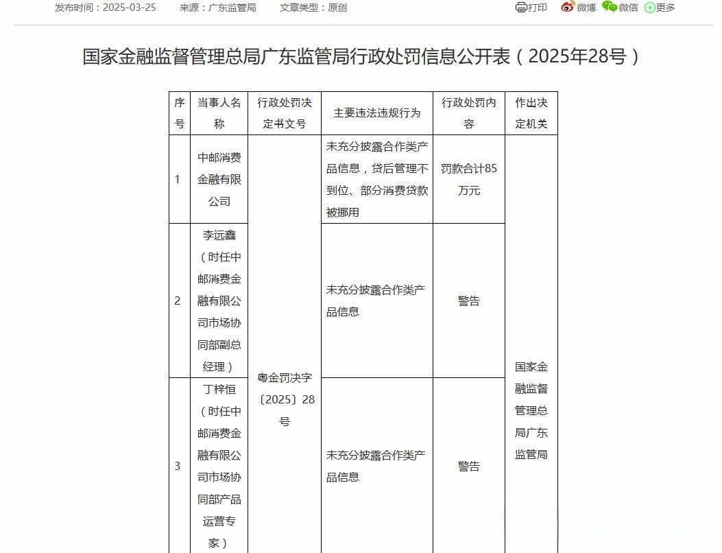 合规漏洞的频现已经引起了监管部门的关注。2025年3月25日,国家金融监督管理总局广东监管局披露,中邮消金因未充分披露合作类产品信息、贷后管理不到位等违法违规行为被罚款85万元,三名相关责任人同步被警告。而这并非其首次被罚,早在2024年7月,中邮消金就因“违反征信异议处理规定”被罚78万元。一年之内两收罚单,无疑暴露了中邮消金在内控管理上的严重缺陷。