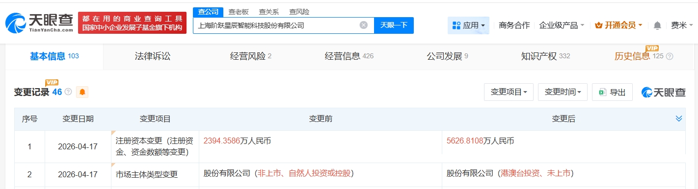 天眼查App显示,近日,上海阶跃星辰智能科技股份有限公司发生工商变更,注册资本由约2394万人民币增至约5627万人民币,增幅约135%。