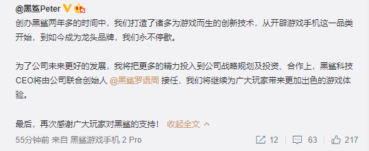 吴世敏随后也在社交媒体宣布黑鲨科技CEO将由罗语周接任。
