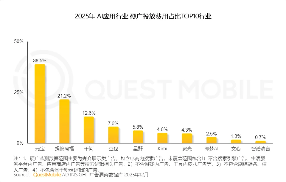 腾讯财报显示,Q4销售以及推广费用同比增长26%,除了少量新游戏宣发外,预计主要用于元宝买量。QuestMobile数据也显示,2025年,元宝硬广投放费用占比为38.5%,远超蚂蚁阿福、千问硬广投放费用占比。