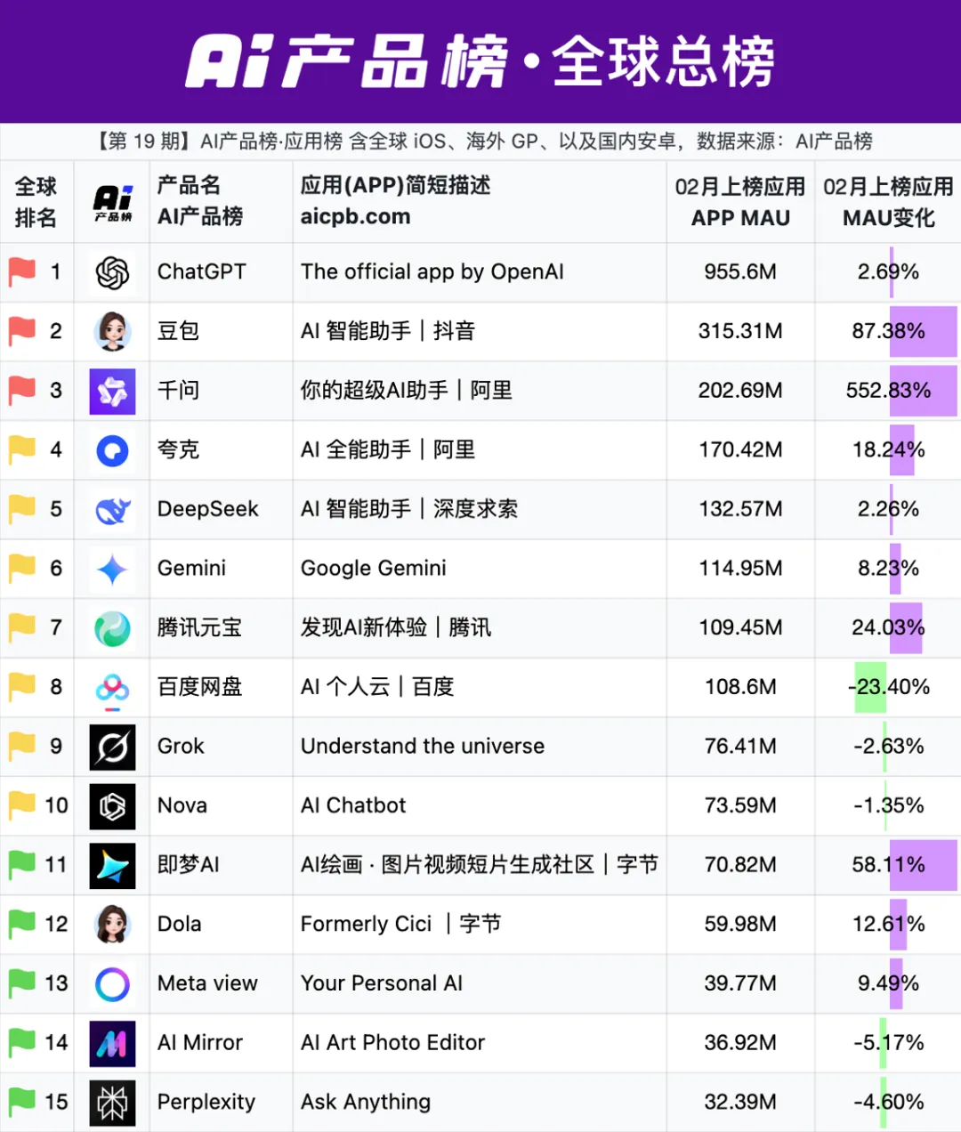 AI产品榜发布了2026年2月全球AI应用月活跃用户榜单。数据显示,字节跳动旗下AI产品“豆包”的月活为3.15亿,环比增长87.38%,强势登顶国内AI应用榜榜首。腾讯元宝月活仅1.09亿,未进榜单前五。