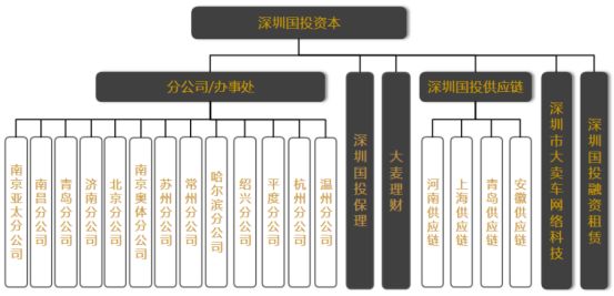 另外,深圳国投资本管理有限公司组织架构显示,公司旗下业务包括13家分公司、4家供应链公司,以及国投保理、国投融租、大卖车网和大麦理财。