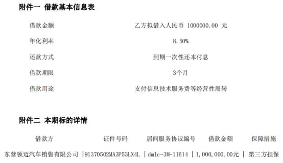 探长在大麦理财投资的第一个标的编号为“麦田3月计划-3M19042801”,根据出借合同显示,项目金额100万元,还款方式为到期一次性还本付息,借款用途为支付信息服务费等经营性周转,借款企业为东营领迈汽车销售有限公司,保障方式为第三方担保。值得注意的是,出借合同中并未出现第三方担保机构名称。