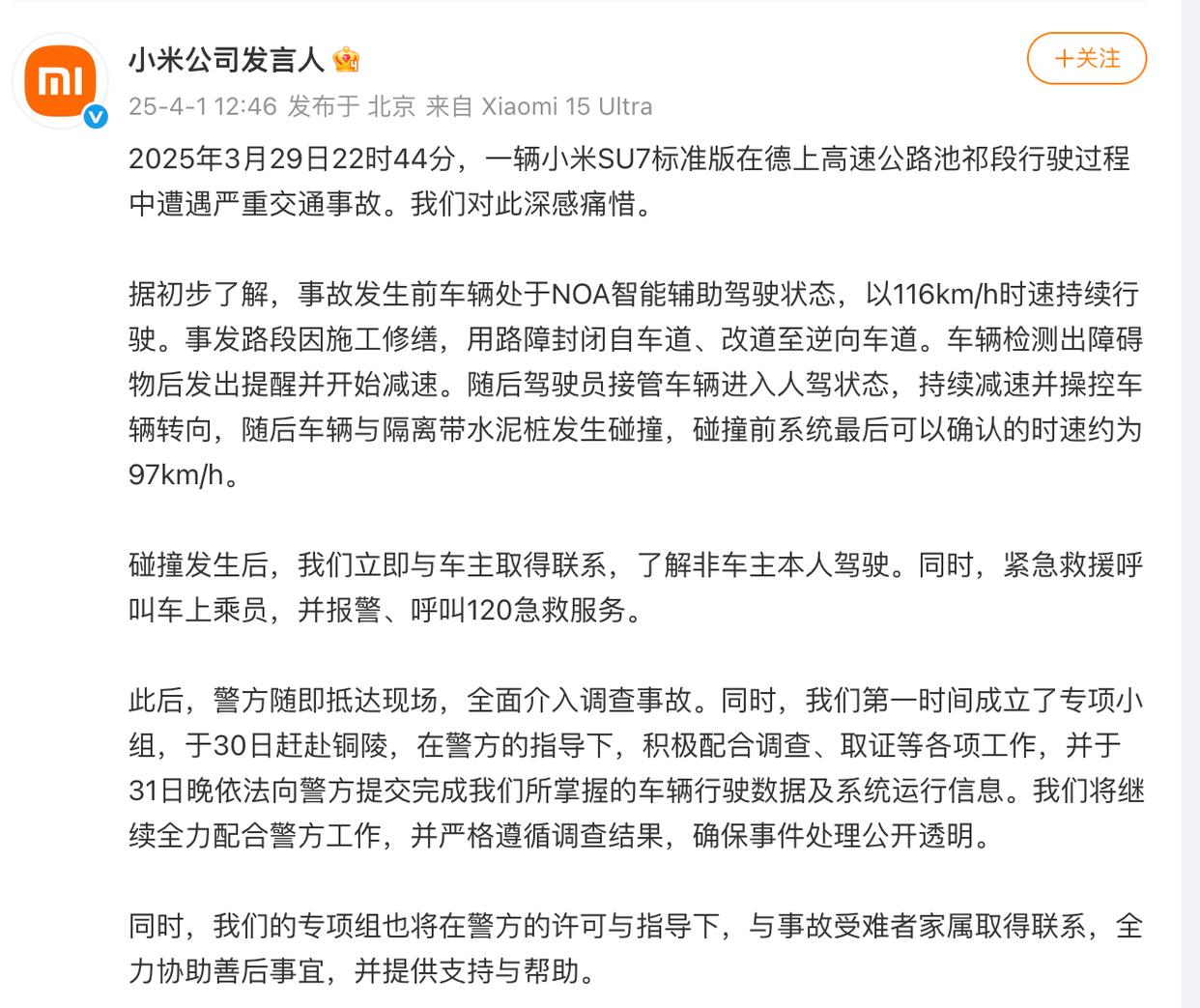 4月1日中午,小米官方微博发布事故说明。小米方面表示,事故发生后第一时间成立了专项小组,于3月30日赶赴铜陵,在警方的指导下,于3月31日晚依法向警方提交完成掌握的车辆行驶数据及系统运行信息。