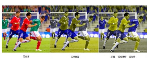 乐融Letv还展示了“色盲辅助”这一黑科技功能——通过对原有画面的色彩进行实时调整(用色盲患者可以感知到的色彩代替其无法感知的部分),使得色盲用户可以分辨出原本无法分辨的内容。