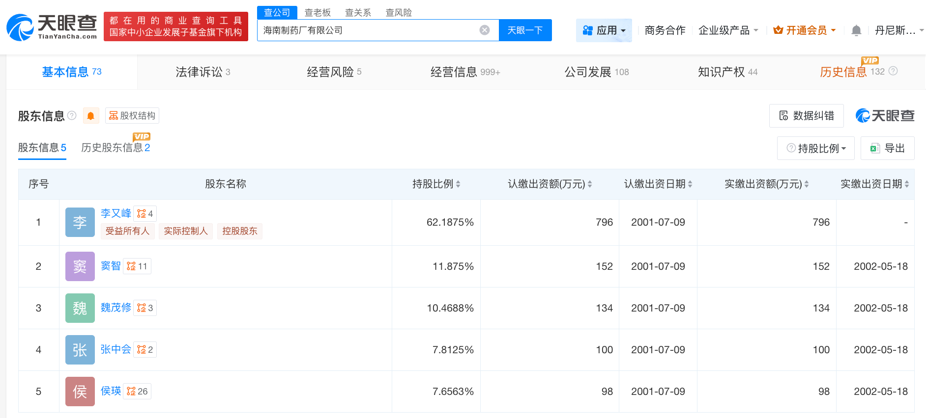 天眼查App显示,海南制药厂有限公司成立于2001年7月,法定代表人为李又峰,注册资本1280万人民币,经营范围包括化学药制剂、片剂、胶囊剂、颗粒剂等的生产、来料加工、汽车运输等,由李又峰、窦智、魏茂修等共同持股。天眼风险信息显示,该公司涉及多个司法案件信息,案由涉及买卖合同纠纷,生命权、身体权、健康权纠纷等。