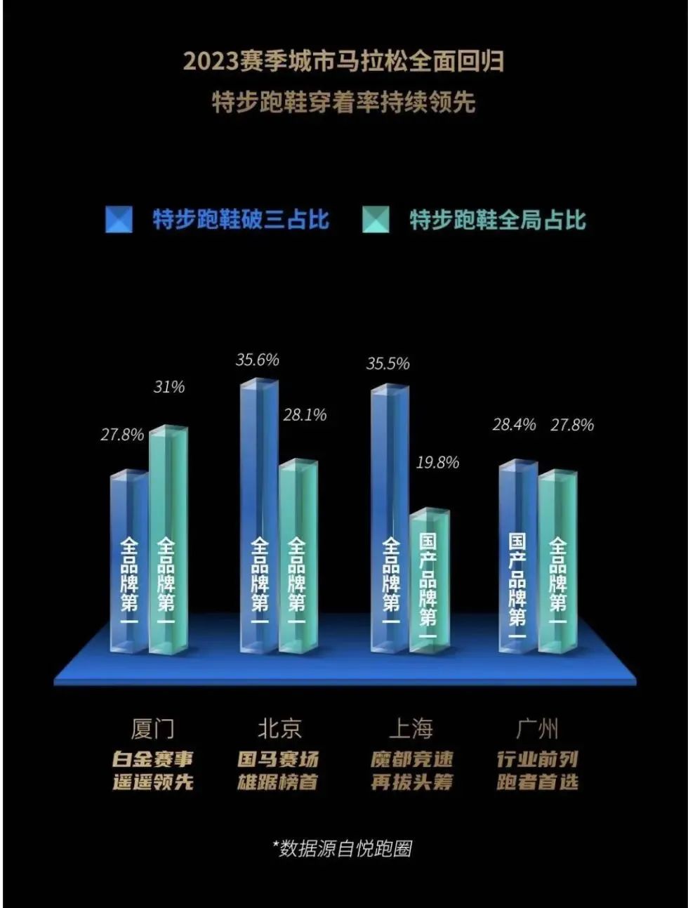 2023年,特步跑鞋在中国马拉松男女运动员百强中整体穿着率分别达到41%和33%,在厦门、北京、上海、广州等城市马拉松比赛中破三占比也均位列全品牌第一。
