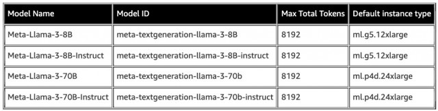 目前,SageMaker JumpStart 中可用的所有 Llama 3 模型,以及每个模型支持的默认实例类型和最大总token数如下: