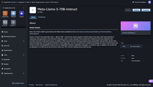 以及通过Amazon SageMaker JumpStart提供的包括Meta Llama 3在内的各种模型,称其客户已可以通过Amazon SageMaker JumpStart使用这两款Llama 3模型,并发布了如何通过SageMaker JumpStart发现和部署Llama 3模型的官方教程博文。