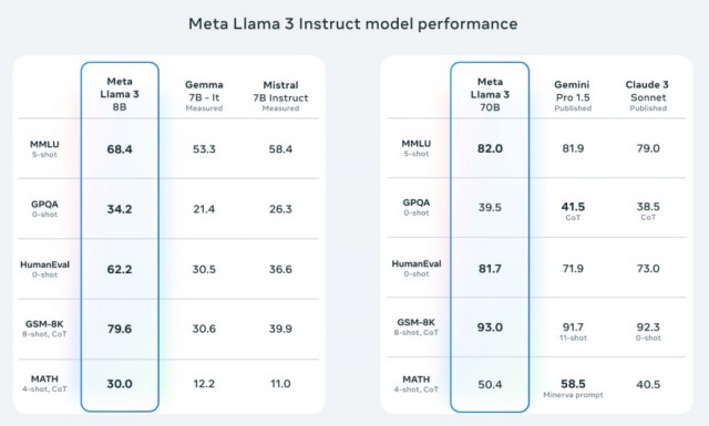 在Meta公布的AI基准测试中,Llama 3 8B、70B模型在语言(MMLU)、知识(GPQA)、编程(HumanEval)、数学(GSM-8K、MATH)等能力上,几乎全面领先于同等规模的其他模型。