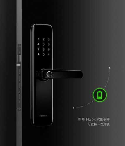 nokelock X1自发电锁是一款拥有无限续航的产品。它通过门把手的机械运动,带动齿轮转动,进而带动电机运转,从而给蓄电池充电,实现机械能量到电能的转化。用户通过日常的开门动作,便可以为nokelock X1自发电锁积累电量。通常每下压5-6次门把手可支持一次开锁电量。解决了消费者在停电或门锁电池没电情况下无法开门的后顾之忧。