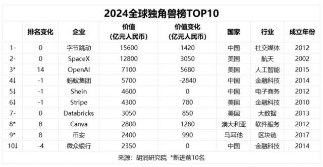 2024上榜的独角兽企业中,OpenAI价值增长最快,增长近5700亿元人民币,跻身榜单第三名;
