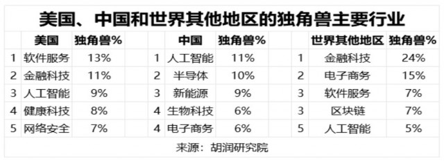美国独角兽企业的主要行业是软件服务、金融科技、人工智能和健康科技;中国是人工智能、半导体和新能源。