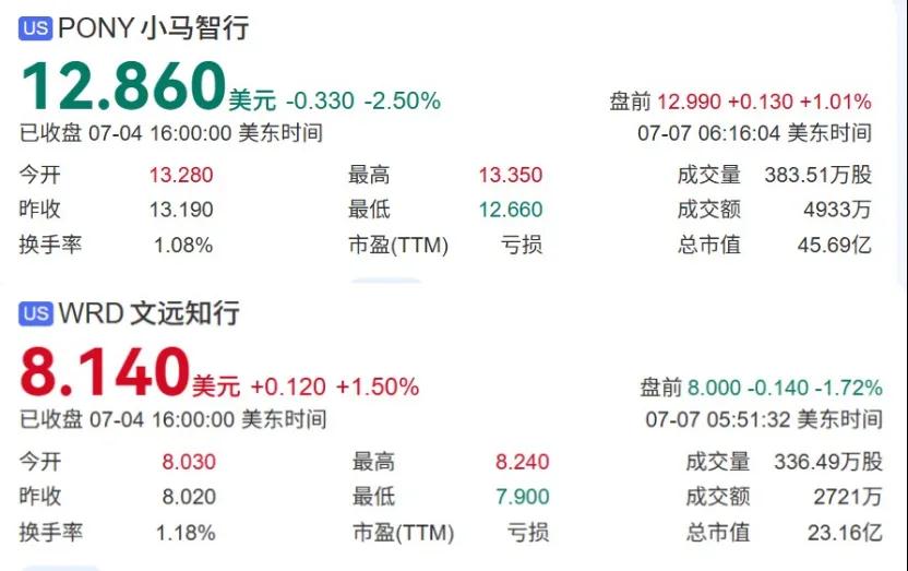 从市值情况来看,文远知行的股价较上市初期已接近腰斩,市值约为23亿美元;小马智行在经历了一轮大幅调整后,如今股价已重新回到发行价附近,市值约为45亿美元,约是文远知行的2倍。