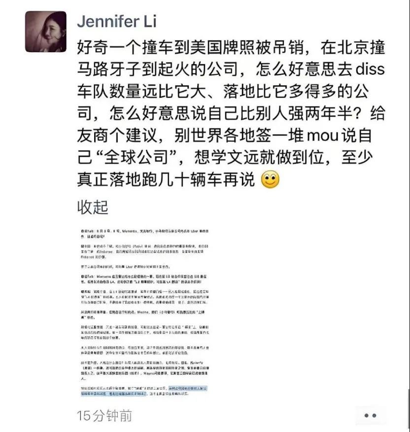 随后,文远知行CFO李璇突然在朋友圈表示:“好奇一个撞车到美国牌照被吊销,在北京撞马路牙子到起火的公司,怎么好意思去diss车队数量远比它大、落地比它多得多的公司?”
