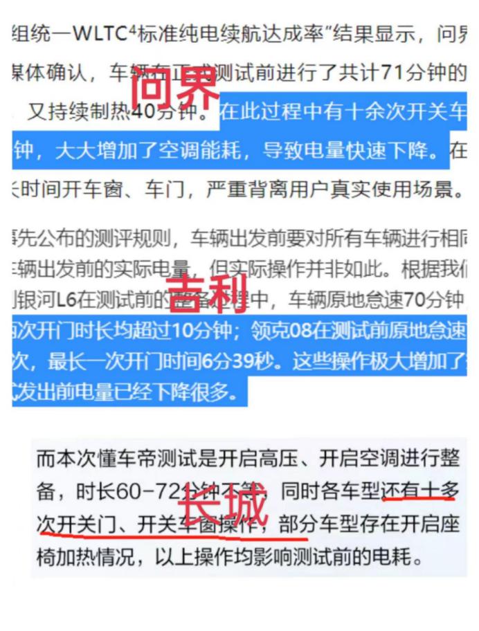 从AITO汽车官微、吉利汽车和长城汽车三家车企的公开信息综合得知,懂车帝对三家车企的原地怠速时间和开门的次数都有差异。例如,问界在车辆在正式测试前进行了共计71分钟的空调制热,有十余次开关车门、车窗的操作,其中最长时间超过3分钟。“