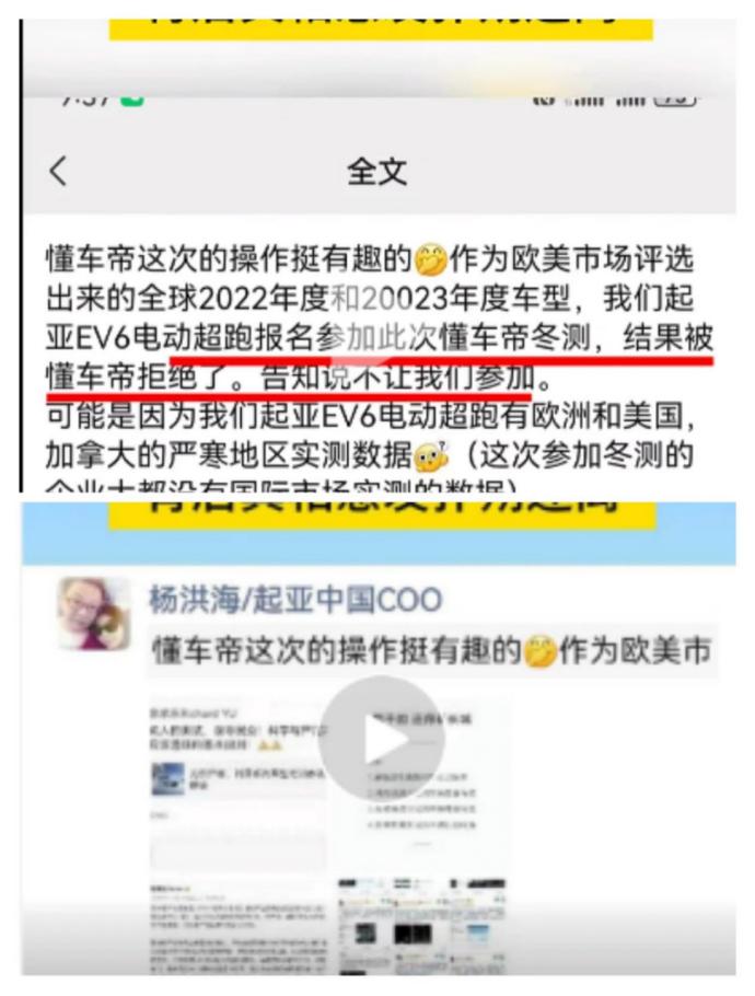值得玩味的是,「AUTO芯球」看到视频号”汽车情报“一个视频大概内容为,杨洪海先生表示:“懂车帝这次的操作挺有趣的,起亚EV6电动超跑报名参加此次冬测,结果被懂车帝拒绝了告知说不让参加名参赛却被拒,背后真相愈发扑朔迷离。”