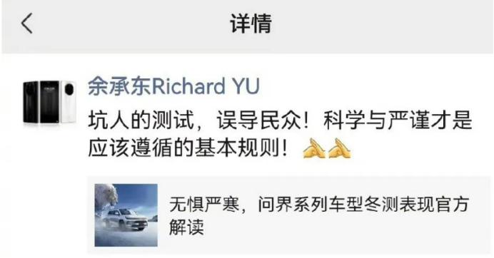近日,2023懂车帝冬测引发热议,华为余承东看了内容后在朋友圈怒怼:“坑人的测试!科学与严谨才是应该遵循的基本规则!”两个感叹号足以说明华为余承东对此时的态度。